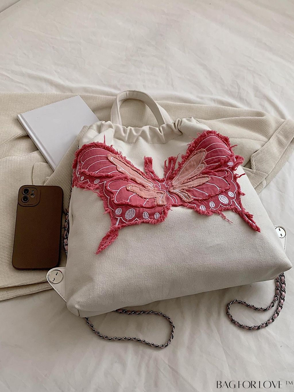 BagForLove - Fashionable Butterfly Patch Decor Drawstring Shopper Bag with Double Handle and Chain - Polyester